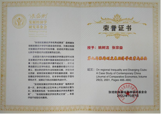 国产一区二区日本在线李安民经济研究院院长姚树洁教授发表在Journal of Comparative Economics(2001,29(3):466-484)的文章On regional Inequality and Diverging Clubs:A Case Study of Contemporary China,于2022年获第九届张培刚发展经济学优秀成果奖